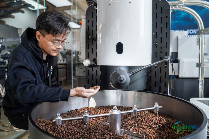 2025年12月10日,韩君玮在昆明南来盛咖啡店内烘焙咖啡豆。