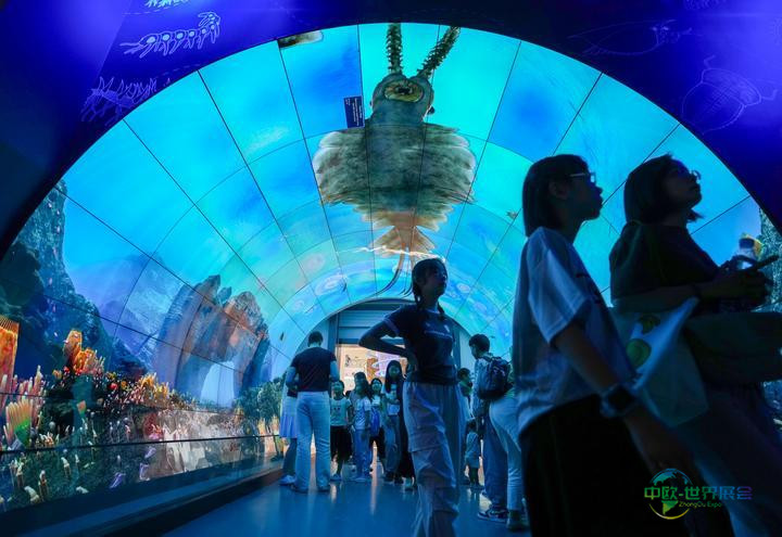 2025年7月15日,游客们在玉溪市澄江化石地世界自然遗产博物馆的“寒武纪海底隧道”内参观。
