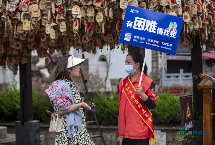 2023年5月18日,一位游客(左)在丽江古城向志愿者寻求帮助。2015年12月,云南丽江古城保护管理局组织成立了丽江古城旅游志愿者服务队,志愿者主要来源于市区机关、古城保护管理局、商户、在校学生及社区居民等,长期在古城内提供旅游咨询、路线指引、文明劝导等志愿服务。
