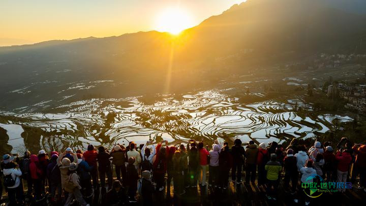 2025年2月27日,游客们在红河州元阳县多依树景区观赏日出(无人机拍摄)。