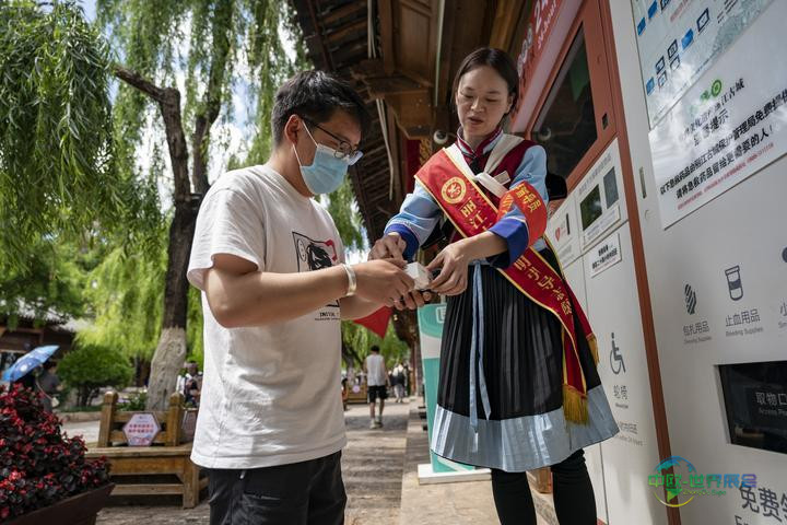 2023年5月18日,一位志愿者(右)在丽江古城为游客提供应急医疗用品。
