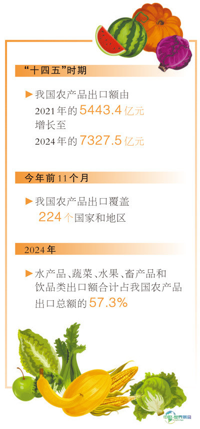 不仅是脐橙,越来越多的中国优质特色农产品正在海外飘香。数据显示,“十四五”期间,我国农产品出口额持续攀升,从2021年的5443.4亿元增至2024年的7327.5亿元,增幅达34.6%。今年前11个月,中国农产品已销往全球224个国家和地区。