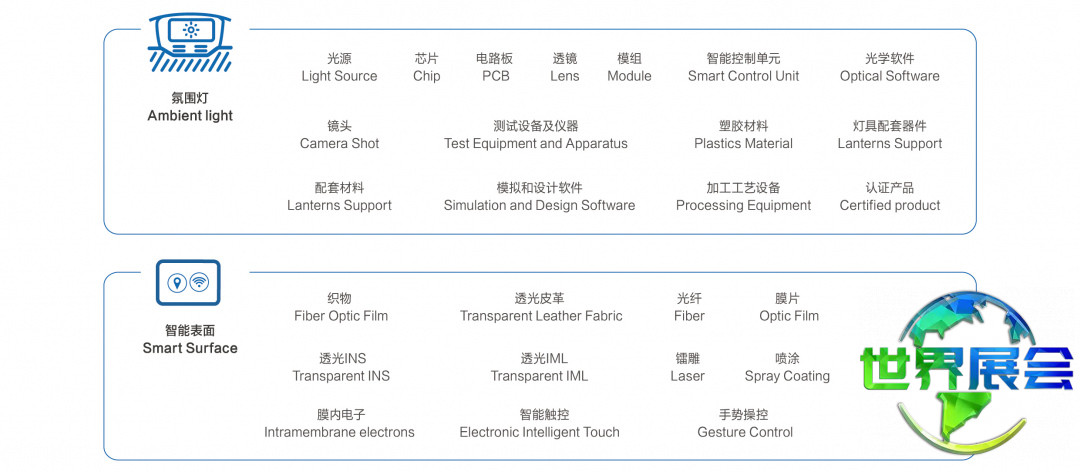整车展示区、汽车灯具展区、光学软件展区、光源、智能控制单元、检测设备及仪器、塑料材料、工艺与设备、灯具配套零部件